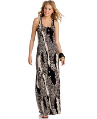 Rayon/spandex; Hand wash; Hits at ankle; Scooped neckline; racer-style back; Sleeveless, with bra-friendly straps.